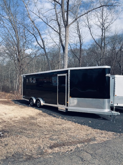 SNOW and UTV trailer, 7.5×22, black .050 exterior skin, quad ply decking with 12 inch kick plates, premium light package with backup lights, rear door canopy with loading lights, 14 x 14 fuel doors driver side, aluminum pull out step, 32 x 72 side access ,9” adde added to box height, elevated spare tire mount with aluminum wheel and tire, spread axle design, all aluminum construction, lifetime structural warranty. $23,400.