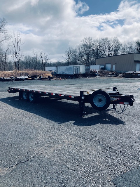 Flatbed pintle hitch, 16,000 pound, equipment, trailer, with full width, fold out ramps, oil filled hubs, Beaver tail with clean